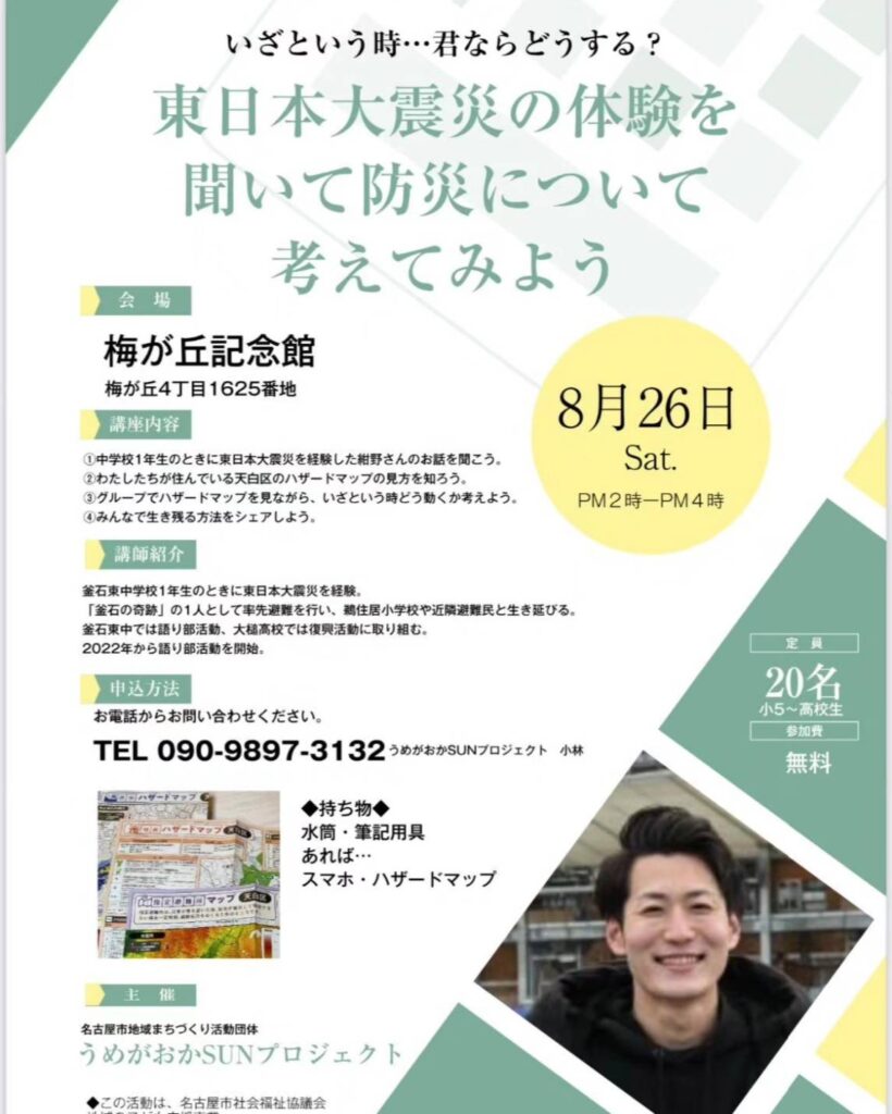 こちらの記事は2023年8月26日に愛知県名古屋市天白区で行われた「東日本大震災の体験を聞いて防災について考えよう~名古屋市天白区梅が丘記念館~」という防災学習会での語り部講演について紹介しながら、防災教育の重要性と「防災教育や防災研修を始めたいけど何から始めたらいいか分からない人」に向けて語り部講演を軸にした防災教育を始める設計が可能になる記事です。